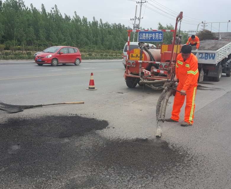 (為了防止修補材料在行車被帶走,修復(fù)好后上面均勻的撒一層小石屑。經(jīng)過一天碾壓后,清掃干凈)